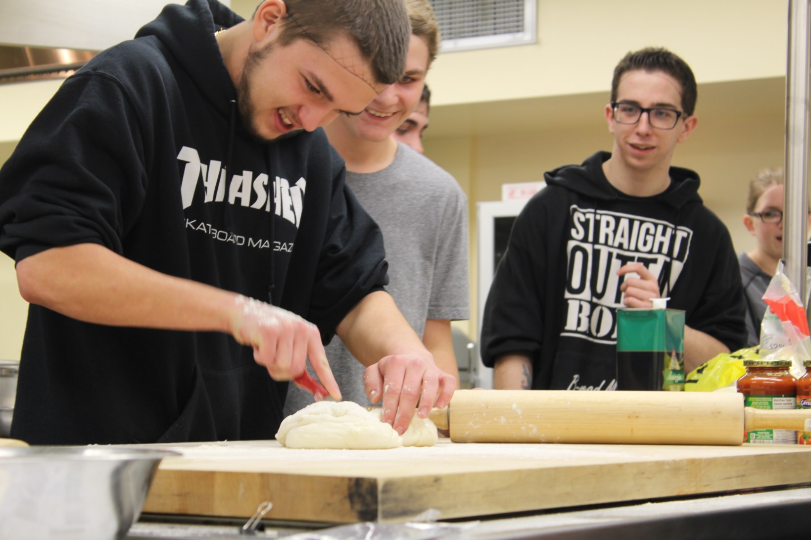 Discovery Collegiate students - Riley Hiscock, Shannon Collis and Brady Hobbs - crafting a nutritious pizza dough at the CNA Bonavista Campus. (Photo credit: C-NA)